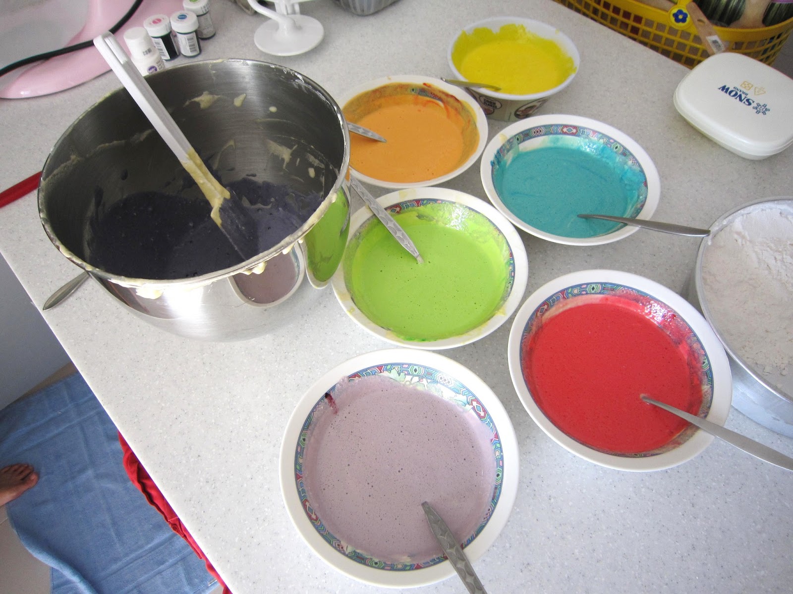 Tuto hmotu si rozlijeme do několika misek, či hlubokých talířů a každou misku obarvíme potravinářským barvivem.